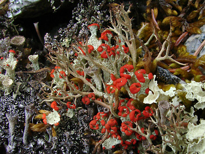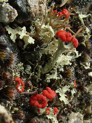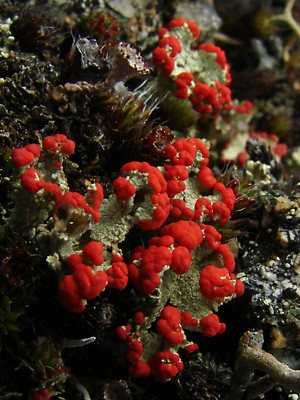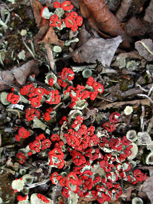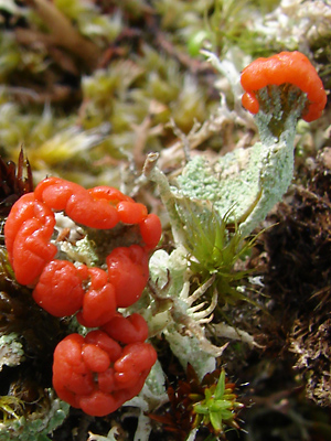 A squamulose-fruticose lichen known as the "red-fruited pixie-cup".