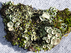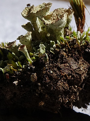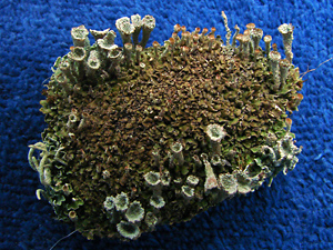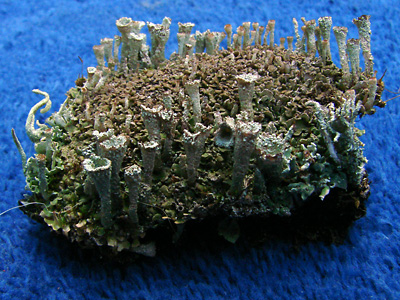 A squamulose-fruticose species known as the "pebbled Pxie-cup".