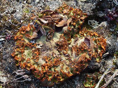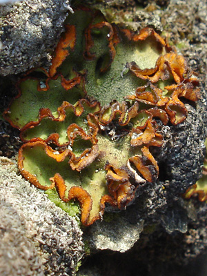 2 photos. A foliose species known as the "orange chocoate chip lichen".