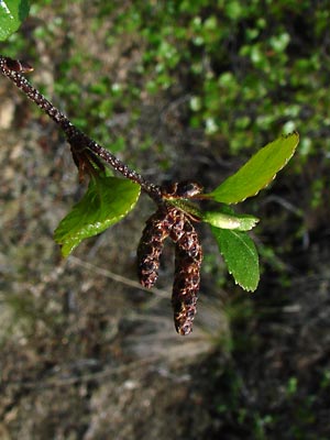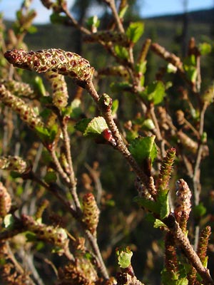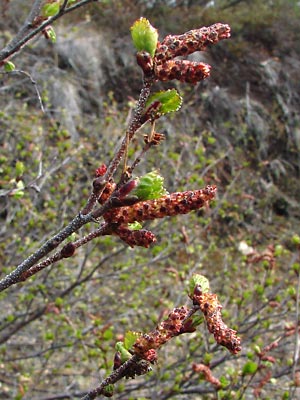and smaller female catkins on