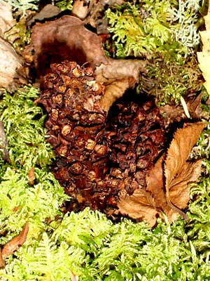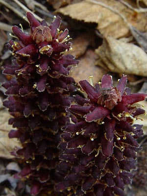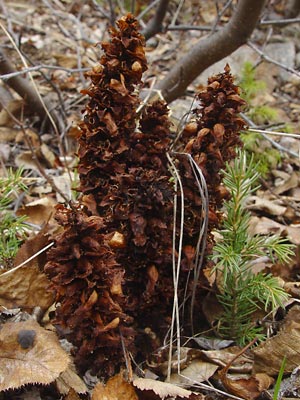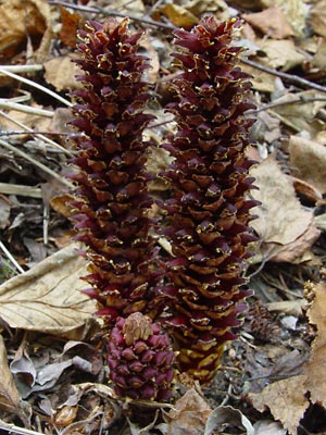 "Broomrape", "northern ground cone" or "poque" a multi-stemmed plant which is parasitic on alder.