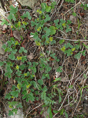 A creeping plant with unusual leaves and tiny yellow flowers known as the