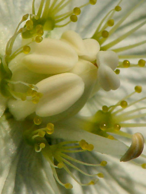 the staminodia (sterile stamens). The calyx lobes are visible beneath