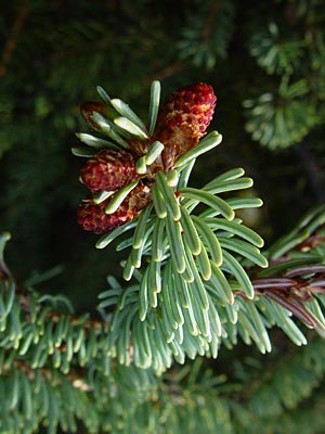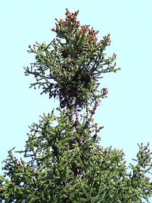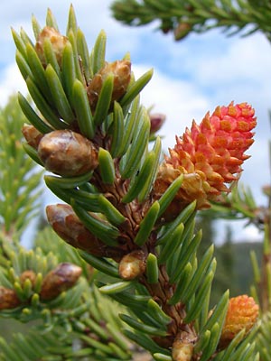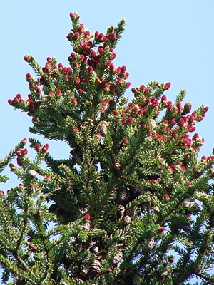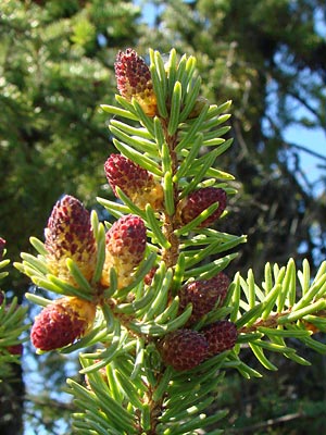 with old cones, male cones (red) at an early