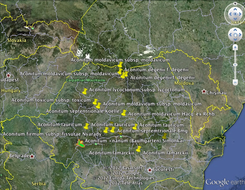 based on over 41,000 records with coordinates. This map is from http://data.gbif.org/species/5333413/. Click on "Countries with Occurances". 32546 specimens were collected in Sweden and 6734 were collected in Norway. By checking the box next to "United States" and clicking on "Refine search" you will advance to a page which will lead to the kml file for the 717 specimens colleced in the US. Under Download: click on "Google Earth (maximum 50,000)". This brings you to a new page. Click on "occurrence-search-xxx...xxx.zip (approx file size 18 KB)" to download the kml file. This file will be in an "occurrance search" folder. Double click the file to activate the Google Earth program. If you don't have the program, use Google to find and download it. Google Earth gives you access to the individual records by clicking on the symbol on the map for that record. Below is a screenshot from Google Earth for Aconitum (monkshood) in Romania.